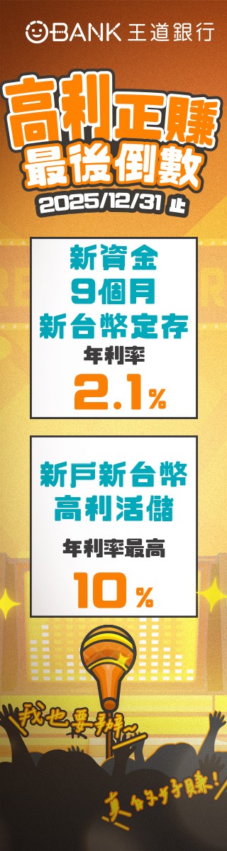兆豐數位帳戶 Megalite 活存享 NT$10 萬內享「一年期定存年利率 + 0.26%」年利率,2025/03 目前為 1.975% 活存利率,每月再享免手續費跨行提款與跨行轉帳各 10 次優惠。(~2025/12/31)